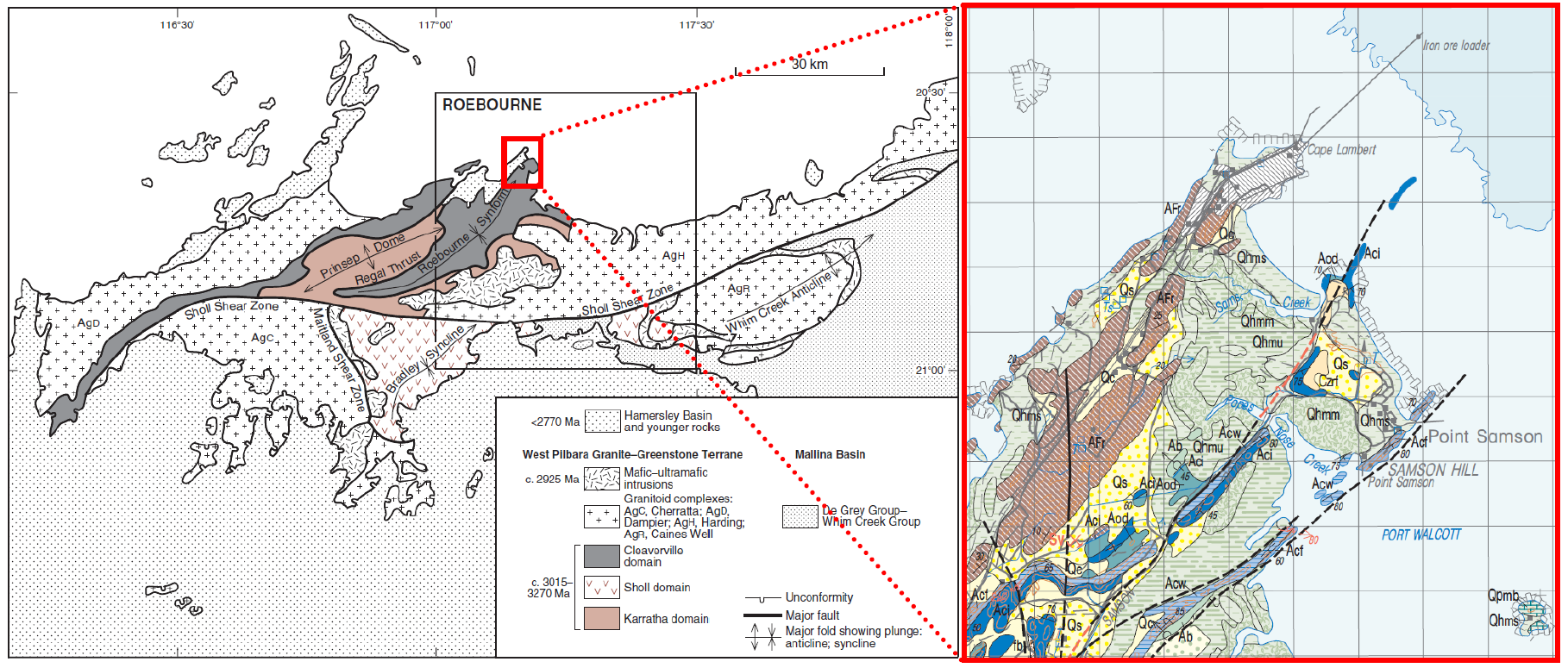 Cape Lambert is in the north-western margin of the Pilbara Craton. Hickman et al. (2000) further subdivided this region as an Archaean granite-greenstone terrane, now referred to as the West Pilbara Granite-Greenstone Terrane (WPGGT). The different tectono-stratigraphic domains, including the WPGGT, in the wider region of the site are presented in Figure 2.
