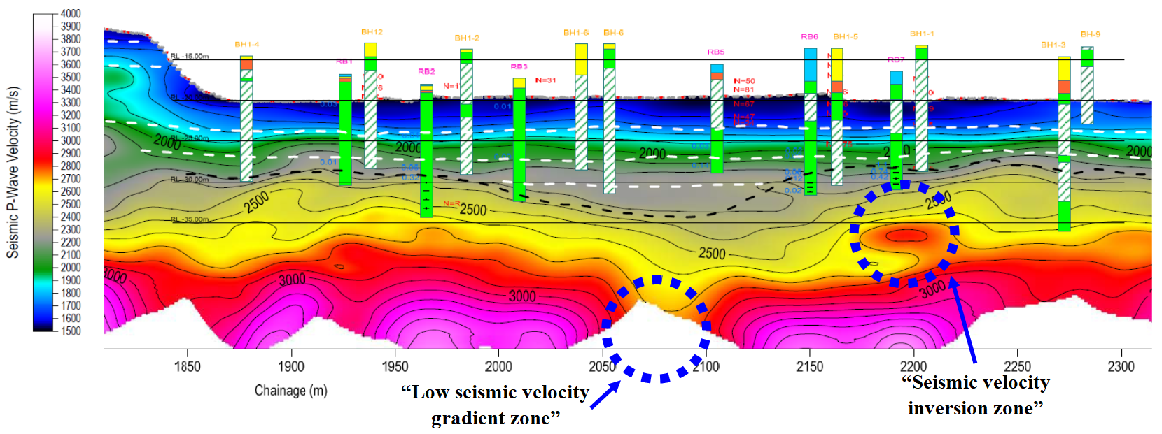 Geophysics provided an efficient and cost-effective means of collecting subsurface information. The primary benefit of utilising geophysical techniques was the ability to increase spatial sampling density so that background and inconsistent conditions could be identified early in the investigation. The first phase of geophysics identified two main anomalous features around CH2080 m and CH2200 m in the replacement dolphin area (Figure 3). At CH2080 m a low seismic velocity gradient zone is observed on the section and indicates less competent basement rock. In contrast at CH2200 m, a velocity inversion was identified above the basement rock, which indicates potential floaters or stronger material over weaker material. Boreholes, BH-A2 and BH-A3, were planned at these two locations to further investigate these anomalous velocity gradient changes as these locations also coincided with proposed new dolphin locations.