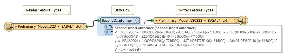 Figure 4: FME workflow for the conversion of “Basalt” DXF in MGA to RRPG.