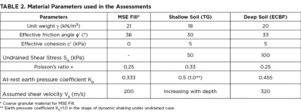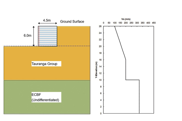 Typical soil parameters are taken based on the author’s knowledge and local experiences in Auckland area. A 16m-thick shallow cohesive soil layer and 10m-thick underlying hard stratum are defined in the subsurface profile, which are considered representative of Tauranga Group (TG) and ECBF (East Coast Bay Formation) extensively encountered in the Auckland region. The base of model is considered as unweathered (intact) rock having a shear velocity of 800m/s and it can be assumed to be rigid. Groundwater table is taken to be at the level of toe of the wall. Table 2 and Figure 2 give material parameters and variations of several critical parameters (dynamic shear modulus and damping ratio).