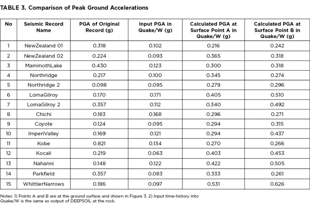 15 time history records are selected in the analysis. Basic features of them are summarized in the Table 3. To reduce the data storage, vibrating noise at the end of the recorded acceleration time history, which represents very little ground motion, has been ignored in the dynamic analysis. These seismic records are scaled in DEEPSOIL 7.0 (2016, 2020) for the first step to match the selected specific seismic case of interest with the design free field PGA am=0.28g.