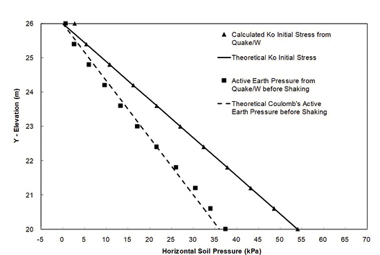 The initial stress conditions under both Ko static and the KA stress state are investigated to calibrate the finite element model. Here, Ko is the static earth pressure coefficient and can be written as Ko=1-sinφ. KA is Coulomb’s active earth pressure coefficient. Comparisons of calculated horizontal stresses from the model and theoretical estimations are plotted in Figure 5. As can be seen in the figure, there is basically a good agreement between theoretical derivations and Quake/W results under both stress conditions. This, therefore, well demonstrates the reliability and rationality of the model adopted in this study.