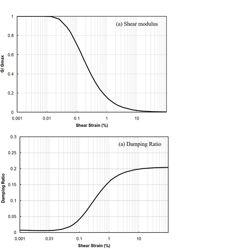 Degrading pattern of dynamic shear modulus developed by Ishibashi and Zhang (1993) is taken into account in the study. It has been recognized that TGA falls among CI, CH and CV, exhibiting intermediate plasticity, high plasticity further to very high plasticity with a Plasticity Index PI value changing significantly (20 ≤ PI ≤ 60) (BRANZ, 2002). For the purpose of this investigation and also for simplicity, a figure of PI=35 is selected considering it can be deemed as representative of major part of TGA of CH. PI=35 is also used for estimation of damping ratio function proposed by Kramer (1996).