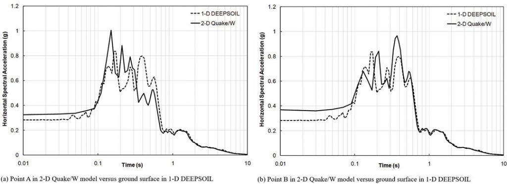Deconvolution of chosen recorded surface acceleration records was implemented using DEEPSOIL 7.0 (2016, 2020) by running an equivalent linear analysis on one-dimensional soil column model. The model geometry and material parameters are kept the same as given in Figure 3 and Table 2. Deconvoluted time history records at the top of rock (the bottom of the numerical model) were directly input into Quake/W models to assess responses of the retaining wall. Calculated PGAs and spectral responses of dynamic motions at ground surface obtained from Quake/W modeling are compared with those derived from DEEPSOIL analysis. Table 3 gives a comparison of PGAs. As it shows, some discrepancies in PGAs and spectral responses are discovered and several seismic records (No. 6, 7, 12, 13 and 15 named in the table) yield much higher PGAs than designed PGA=0.28g. To ensure the feasibility and appropriateness of the Quake/W modeling, their corresponding time histories are eliminated in the analysis and accordingly their results from Quake/W are excluded in the following discussions. Figure 4 illustrate a typical comparative result for horizontal spectral acceleration for No.2 seismic record. Despite there are differences in cyclic peaks they generally appear comparable with each other.