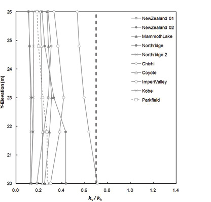 Vertical accelerations can be taken from calculations and, therefore, this makes it possible to review vertical seismic coefficients produced on the back of wall in every dynamic analysis. The ratios of kv/kh along the height of the wall at the vertical plane of X=25.5m are given in Figure 7. It suggests that the magnitude of kv/kh changes from 0.1 to 0.7. This observation is well consistent with the estimation of Stewart et al. (1994) who recommended an estimated kv=2/3kh based on seismic data in Los Angeles area. No doubt kv=(0.67 to 0.7)kh is a conservative estimation and it shall be deemed as an extreme case. For the engineering design, it seems that taking kv=(0.2 to 0.3)kh would be more realistic with a moderate conservatism.