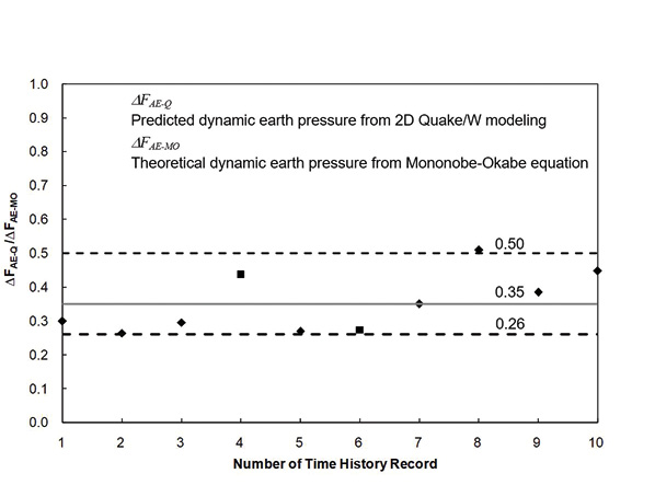 The dynamic analysis performed in this study also gives the dynamic horizontal total active stress acting on the back of wall mass and, therefore, the total active earth pressure can be determined by integrating it over the entire height of the wall. No doubt the maximum pressure (denoted as FAE-Q) over the duration of ground motion is considered to be critical and is of our concern. By using it, active pressure increment ΔFAE-Q can be subsequently derived by subtracting static total force on the active side of the wall computed in the step before shaking. The ratio of ΔFAE-Q/ΔFAE-MO is plotted in Figure 8 for all the ten seismic records and it illustrates the ratio changes primarily changes between 0.26 and 0.50 in case that vertical seismic coefficient kv is zero. In this case, kh can be calibrated based on this ratio and is calculated to be varying from 0.32 to 0.52 provided kv=0 is adopted, to match the obtained value of ΔFAE-Q/ΔFAE-MO. On the other hand, in the event that a vertical acceleration is taken by using 10% to 70% of horizontal acceleration, kh can be calculated to vary from 0.32 to 0.58. These data indicate that kv is not sensitive to the derivation of kh and a generalized range of kh=0.32 to 0.58 may be appropriate to include two different cases. Cai and Bathurst (1996) proposed a theoretical solution to the critical acceleration coefficient previously given that the factor of safety against base sliding failure is expected to be 1.0. By applying their proposed method and expressions, the critical acceleration coefficient kh can be approximately calculated as 0.35. This implies for the specific case discussed in the context, Cai and Bathurst (1996)’s recommended value is likely to be the lower bound of horizontal coefficient. The author notes NZTA Research Report No. 239 (2003) recommends kh = 0.6am for external stability analysis. Findings obtained in this study demonstrates this recommendation is reasonable and acceptable although it is slightly conservative.