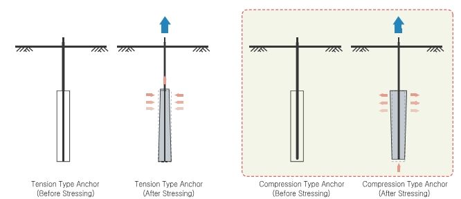 Compression type anchors consist of an unbonded polyethylene (PE)-coated steel strand which transfers the jacking force / load directly to a structural element located at the distal end of the anchor. Unlike the tension type anchors, the grout body for compression type anchors is loaded in compression which is capable of securing much higher loads. However, due to the concentrative design of these anchors, the use of high-strength grout is frequently required to secure the jacking forces at the distal end. Also, it is often difficult to secure concentrative anchorage force in weak soils.