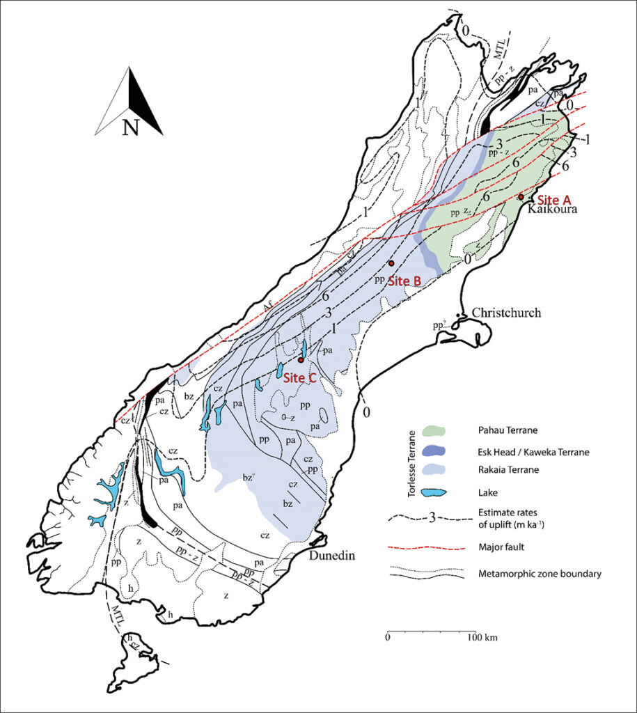 Figure 1. South Island basement rock metamorphic zonation. Terrane zones ignore more recent overlying sedimentary and volcanic rocks. Red dots = approximate field site locations, z = zeolite facies; pp = prehnite-pumpellyite facies; pa = pumpellyite actinolite facies. Figure modified from Landis and Bishop (1972), terrane extents from Cooper and Ireland (2015), and tectonic uplift rates and major fault traces from Williams (1991).