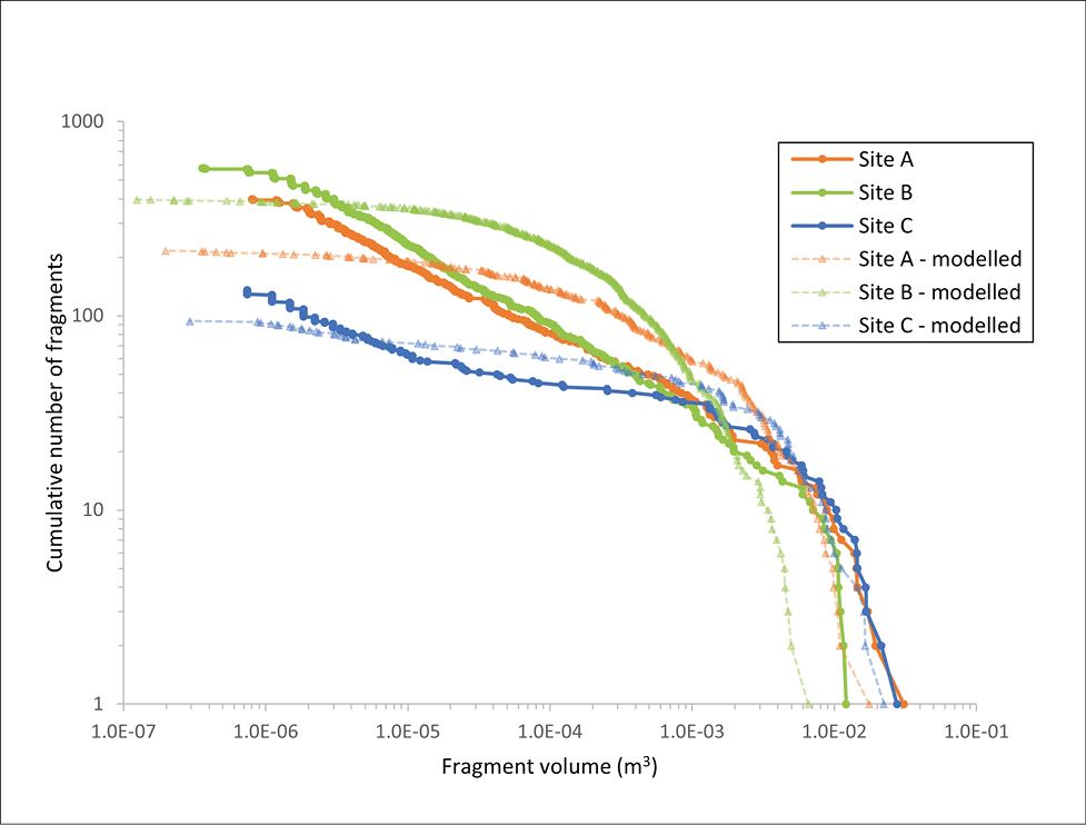 Between the three field sites, the fragmentation rates were highly variable. Site B produced the highest number of fragments per sample (28.75), followed by Site A (20), and Site C (6.75). The percentage of samples that fragmented was also variable between each site, ranging from 90% at Site B to 35% at Site C. From the initial 59 samples that were dropped, 38 (64%) fragmented on the first impact. The 21 blocks that remained intact were subsequently redropped of which nine (43%) fragmented. The number of fragments measured after each drop ranged from one (no fragmentation) to 175. The pre-test modelled fragment size distributions were able to correctly model the relative number of fragments produced during simulated rockfall, however, the size of the largest fragments (>0.01 m3) and frequency of the smallest fragments (0.0001 m3) were underestimated, while the frequency of moderately sized fragments (0.0001-4 m3 to 0.01-2 m3) were overestimated (Figure 4).