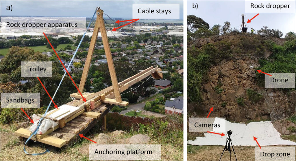 Figure 3. a) rock dropper apparatus attached to anchoring platform at the top of the quarry bench. b) Drop zone setup at the base of the quarry used for the fragmentation testing.