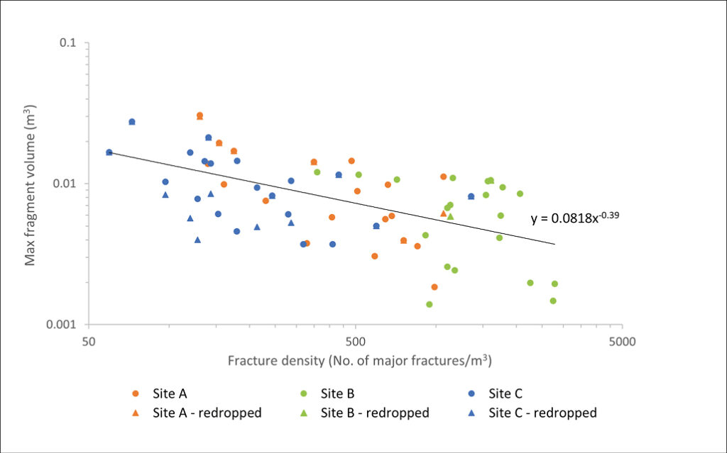 Fragmentation was found to be weakly correlated with the Geologic Strength Index (GSI), fracture density, and block size. GSI may be able to provide a rough indicator of the relative amount of fragmentation that may occur between different sites, however, it is likely too generalised to be able to accurately predict absolute fragmentation rates. Fracture density is more strongly correlated with the largest fragment size, with greater fracture densities yielding smaller maximum fragment sizes (Figure 5). Additionally, the sample volume was found to be relative to the largest fragment such that larger sample volumes produced greater maximum fragment sizes as would be expected.