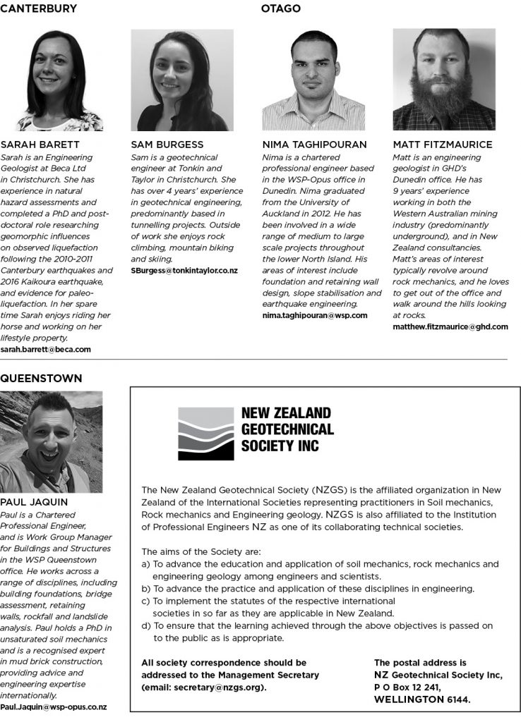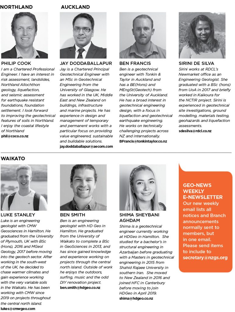 Tauranga branch has a few events in the pipeline. We hope that some of our local members were able to enjoy the NZGS 2021 conference in Dunedin in March. We have arranged for the NZGS Geomechanics Award paper to be presented by Mark Stringer in late May. There have been and continue to be a number of very good online presentations and locally Engineering NZ site visits or presentations which have included large portions of geotechnical / geological work. If members have ideas on presentations or would like to contribute a presentation please get in touch with James or Kim.