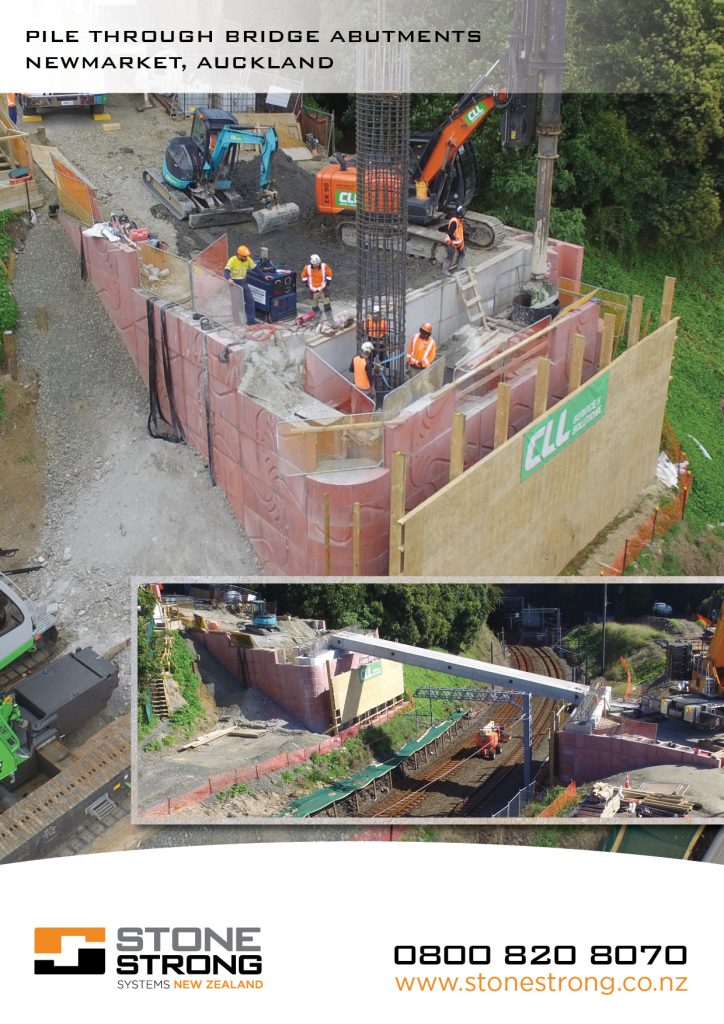Backfill to the GRS abutments consists of crushed recycled materials, interlayered with two high strength geogrid reinforcements (increasing in strength in proximity to the bearing seating) at 500mm spacings. Polyvinyl alcohol [PVA] geogrids with a tensile strength of 400kN/m and 200kN/m were used. Modified gabion bags were used for the facing.