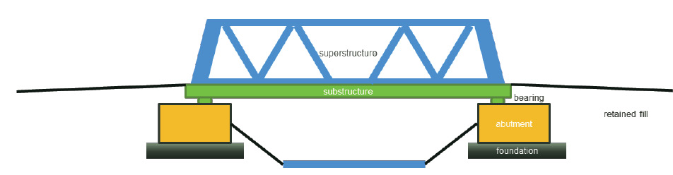 - Substructure: comprises piers, abutments, bearings and all components collecting actions from the superstructure and transferring those into the foundations;