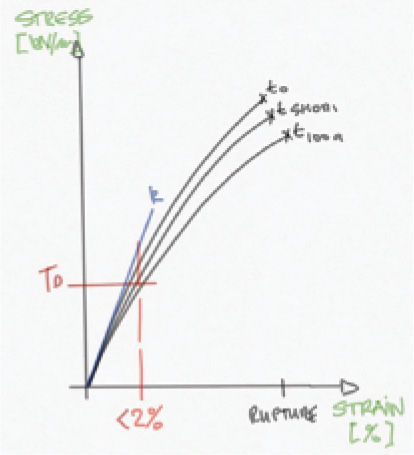 Figure 3 Isochronous stress strain curves [tx] showing high initial stiffness [k] and low creep susceptibility at operational strain levels and design strength [TD]