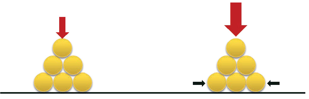 The composite behaviour between granular soil and geogrid reinforcement relies on interaction between both materials. This is because it requires strain compatibility (large deformations in load supporting structures like pavements and very small deformations in earth structure applications such as retaining walls or abutments), (Uchimura, et al. 2004). In geogrid reinforced soils, stability is achieved by lateral support of soil particles enabling significantly higher vertical (axial) stresses to be carried. The reinforcement resists the stresses in tension, a mechanism termed “confinement”, refer to Figure 4.