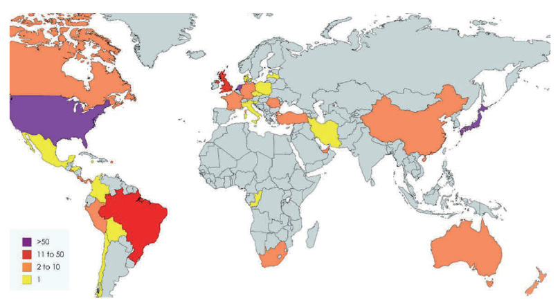 Figure 5 Global distribution of GRS abutments, countries standing out are USA, The Netherlands and Japan, followed by Brazil and the UK (correspondence with G Stevens)