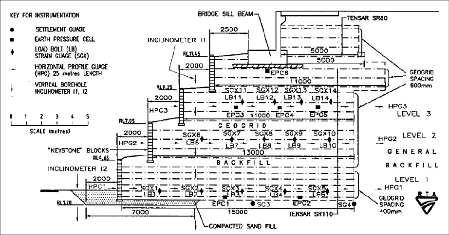 The performance of the GRS abutments was monitored by instrumentation consisting of vertical inclinometers installed to measure horizontal deformations of the abutment, and settlement gauges installed in the bridge superstructure, bearing seat, and abutment wings. The maximum reported horizontal deformation measured after 5 years was 0.2mm, while the maximum settlement recorded at the surface of the abutment, was 4.5 mm, likely due to the compressible subsoil strata. The bridge was subjected to static and dynamic load testing after two years in operation, (Herold 2002), with lateral earth pressures being monitored.