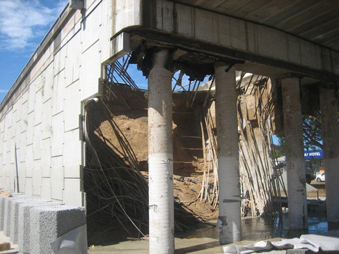 The GRS was constructed on native soil deposits. The sidewalls of the trench were constructed using fine grained fill material with layers of geogrid reinforcement at 400mm to 600m vertical spacing. The vertical spacing of the geogrids was closer below the bearing seat, becoming more widely spaced with depth. A polyvinyl alcohol (PVA) type geogrid was used with tensile strengths ranging from 110kN/m to 200kN/m. The lower strength geogrid was used in proximity to the underside of the bridge bearing seat (foundation). Flexible facings were installed consisting of gravel filled hollow segmental blocks with the connection between the geogrid and the blocks maintained by friction. The geogrid was also wrapped against the facing and into the next layer. The separation distance from the bearing seat (foundation) and the interior of the facing ranged from 0.5 to 1.5 metres.