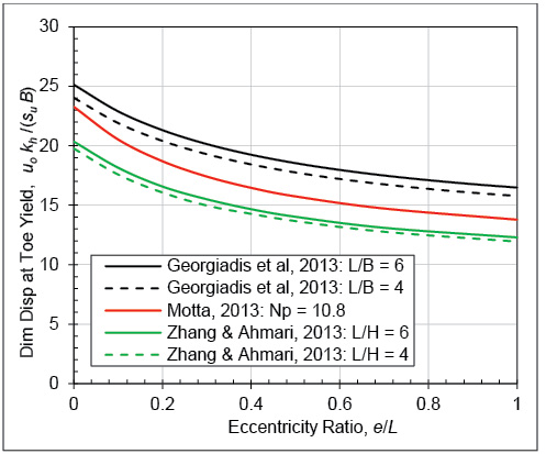 Dimensionless ground level displacements (uo kh /su B) resulting from the lateral load that initiates yield in the soil at the pile toe calculated using Georgiadis et al, 2013, Zhang & Ahmari, 2013, and Motta, 2013 are compared in Figure 16. Although all three methods are based on quite different Np variations with depth, they give ground level displacements that agree within about 25%. All three methods are based on the assumption that the modulus of subgrade reaction kh is constant with depth. The deflection analyses for Georgiadis et al, 2013 and Motta, 2013 assume that the modulus of subgrade reaction varies linearly with displacement up to the soil yield level (elastic-plastic response).