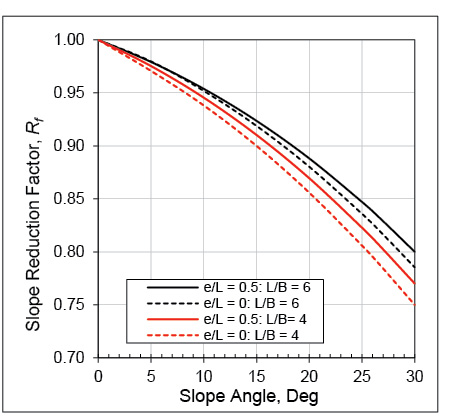 Equations 13 to 19 from Geogiadis et al, 2013 were used to calculate the lateral load capacity reduction from the level ground capacities for poles located at the crest of a slope (b = 0) and for poles located on level ground at a distance of b = 2B from the crest. The pile adhesion factor α was taken as 0.5. Analyses were carried out for eccentricity ratios e/L of 0 and 0.5, L/B ratios of 4 and 6 and for slopes varying from 0o to 30o (measured from the horizontal). The reduction factor Rf = lateral capacity on sloping ground capacity/lateral capacity on level ground is shown in Figures 17 and 18 for b = 0 and b = 2B respectively.