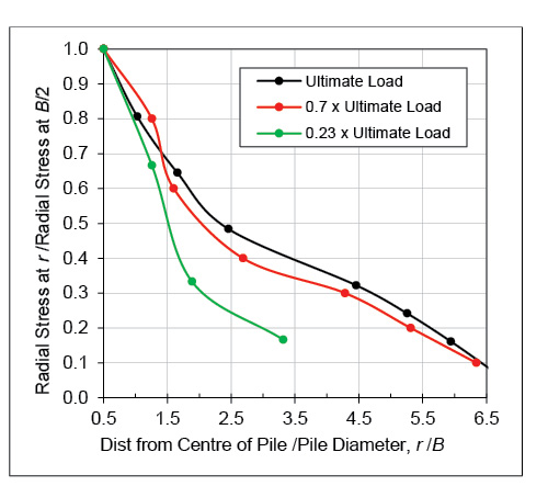 Soil pressures measured in the soil at a depth of 352 mm were presented in contour plots for a number of load levels up to the ultimate load reached at the end of the test (Wood, 2021). For the present study the radial stress in the soil along a diameter at θ = 0 were scaled from these contour plots and are shown in Figure 2 for load levels of 1.0, 0.7 and 0.23 of the ultimate (3.8 kN and head displacement of 86 mm).