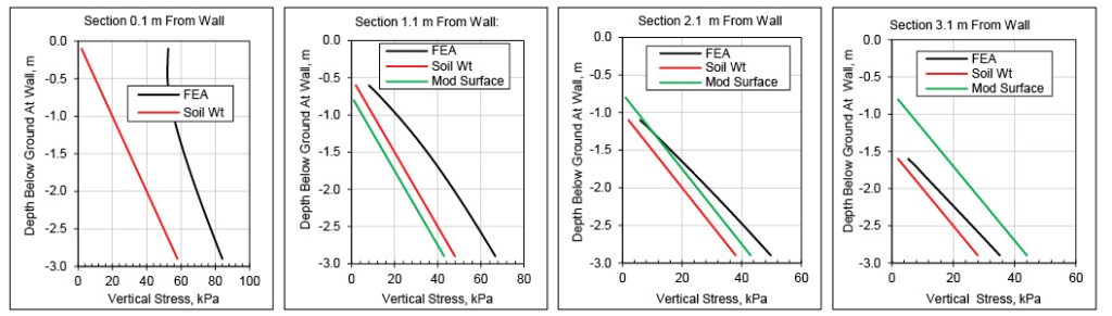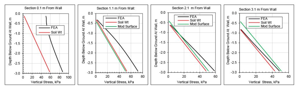The FEA vertical stresses calculated by both models are greater than the stresses calculated from a simple analyses based on the unit weight of the soil and the depth below the slope surface. The differences exceed 50% near the wall face and reduce as the distance from the wall increases. Differences become less than 15% at a distance of 3.1 m from the wall. The weight of soil retained behind the wall face clearly has a major influence on the vertical stresses below the toe of the wall for a significant distance in front of the wall.