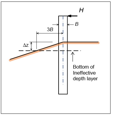 a) Increasing the eccentricity e by the ineffective soil depth of Δz to give an effective eccentricity ee and reducing the embedded length L by Δz to give an effective length Le. The lateral load capacity at toe soil yield was then calculated using (Equation 38 from Wood, 2021):