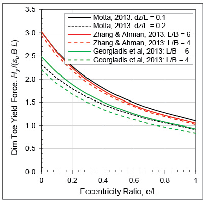 The toe yield capacity is recommended for design (Wood, 2021) and this capacity is about 15 to 20% lower than the ultimate capacity for all the methods. Figure 14 shows that the toe yield capacity from Georgiadis et al, 2013 agrees reasonably closely with the Motta, 2013 value for Δz/L =0.2 and is about 20% to 15% lower than the capacities given by Zhang and Ahmari, 2013 for L/B values of 4 and 6 respectively.
