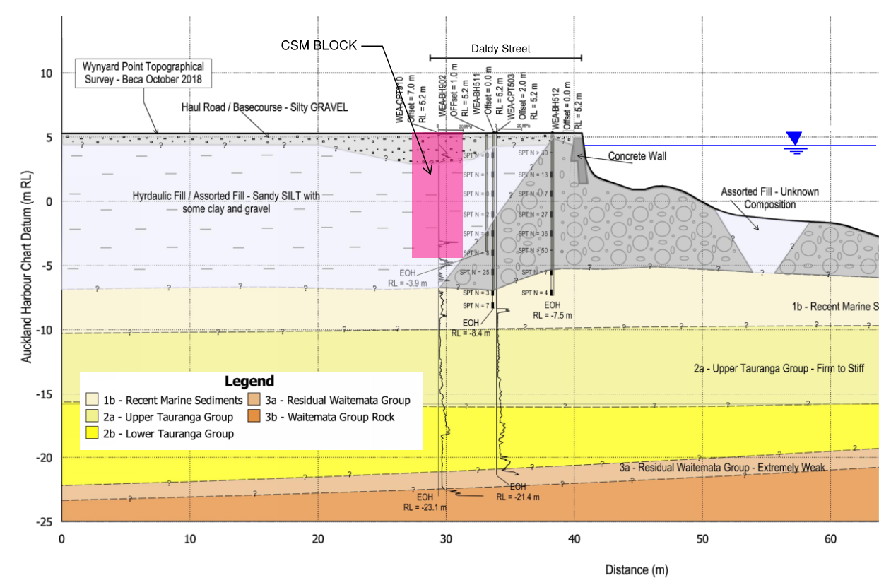 The published geological map of the area indicates that the work area is underlain by hydraulic fill (reclamation land area), overlaying residual soils and rock of the East Coast Bays Formation. Reclamation to form the existing Wynyard Quarter occurred in the 1920s to 1930s, mostly hydraulically placed material including sandy silt with some clay and gravel within the perimeter rock bund comprising basalt boulders and cobbles. A rock faced sea wall was constructed on top of the perimeter bund and hydraulic fill was placed behind the bund to construct the access roads and reclaimed land. A cross-section of site geology at CSM location is shown in Figure 2.
