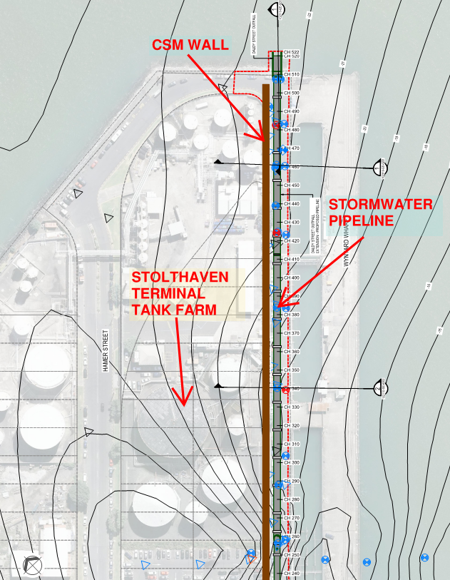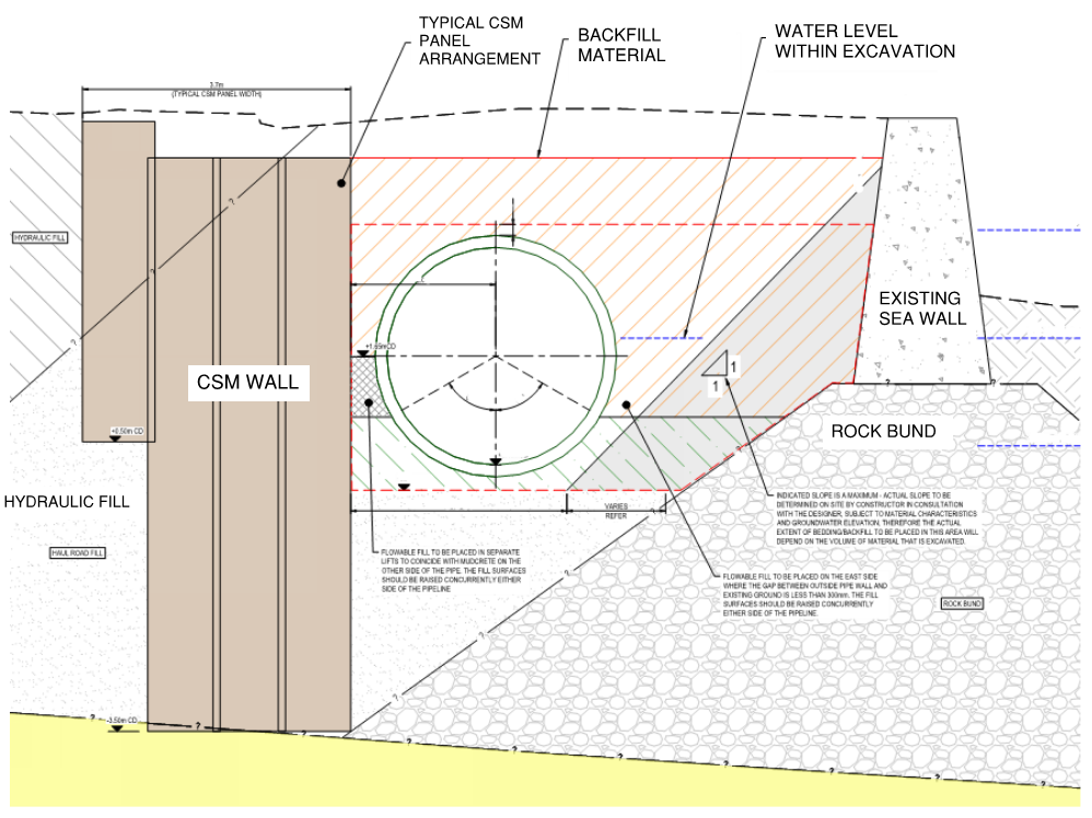 Multiple rows of CSM panels were required, forming a gravity retention system in a narrow corridor over a 500m long section in reclaimed fill immediately adjacent to the harbour on one side, and bounded by an operating fuel storage tank farm on the other side. Wagstaff Piling was engaged for the CSM works. The pipeline would be laid underwater in a submerged trench alongside the gravity retaining wall, with the other side of the excavation protected by an existing concrete sea wall built on the original rock-filled bund wall. Interlocking CSM panels were designed as a gravity block, to retain the saturated low strength reclaim fill, and furthermore to limit ground deflection during the excavation and installation phase. Project overview and pipeline layout plan are presented in Figures 1a and 1b.