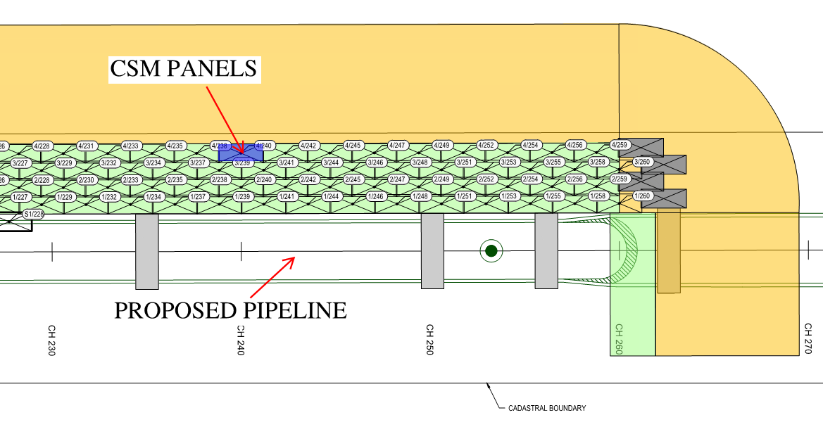 Early laboratory mixing trials established a starting point for cement content at 200kg/m3, calculated by weight of the untreated soil volume (UTS), i.e. the theoretical panel volumes. CSM trial mixes were carried out to verify the initial design using GP cement. A schematic view of pipeline section with four rows of CSM panels are shown in Figure 3. CSM panels are designed to tie into the rock bund in the first row adjacent to the proposed pipeline. 8.5m deep CSM treatment is required for trench stability.