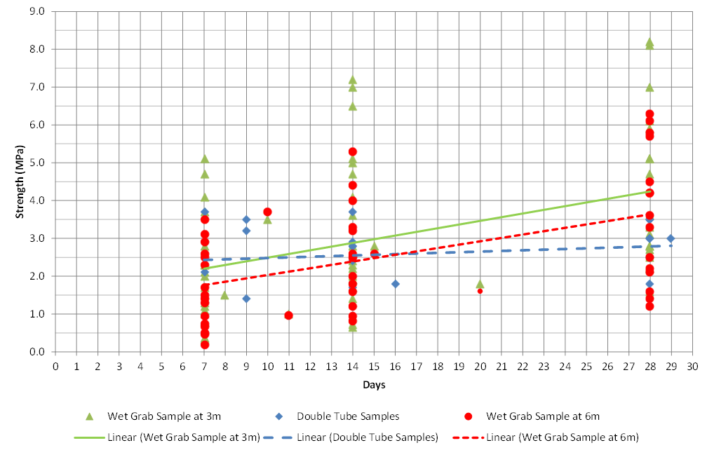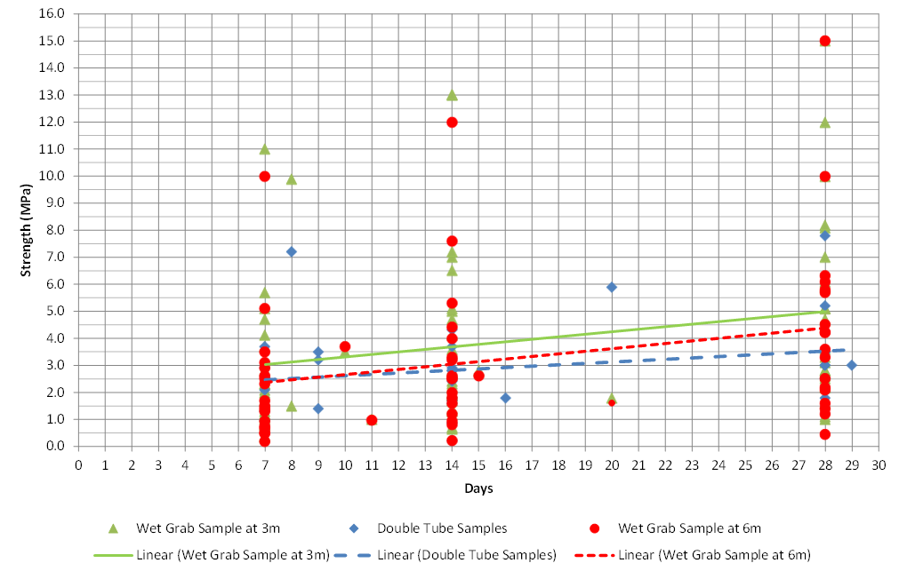 - Early assessment of strength was based on 7day UCS averages, and a relationship was quickly derived with strength gain vs time out to 14 and 28 days, and allowed for progressive reductions of the cement content as the works progressed;