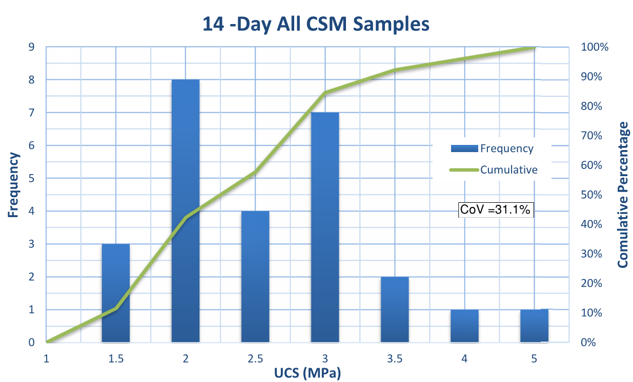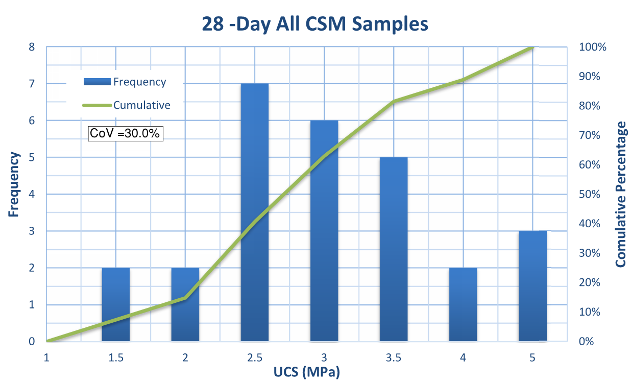 Frequency distributions were plotted for the UCS results, at differing ages, shown in Figure 9. By inspection, and also as calculated, the coefficient of variation (COV) reduces as time elapses. Early age variation is common, and the samples tend to normalize as time elapses.