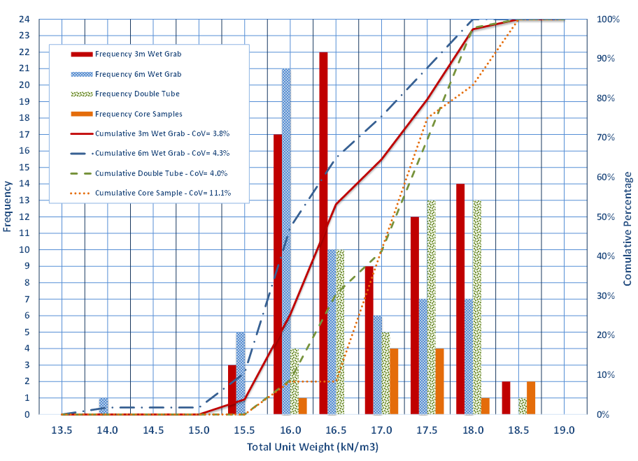 Data was screened to exclude low strength results justified by the test for excess soil particle size, and otherwise a statistical 95% truncation, led on to the narrowing of the variance, as shown in the lower standard deviation and narrowing of the coefficient of variation (COV), as noted in Table 2.