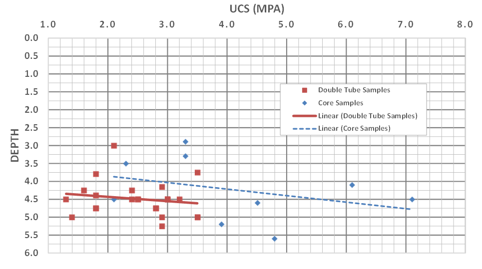 The range of raw data based on all UCS tests for various sampling method are presented in Table 1 and Figure 7 and show highly variable strengths across all sampling methods. This is typical of soil cement samples, and an ongoing project to identify the reasons for the variance, and to come up with ways to justify the variance, and to improve the sampling and testing methods to reduce the variance.
