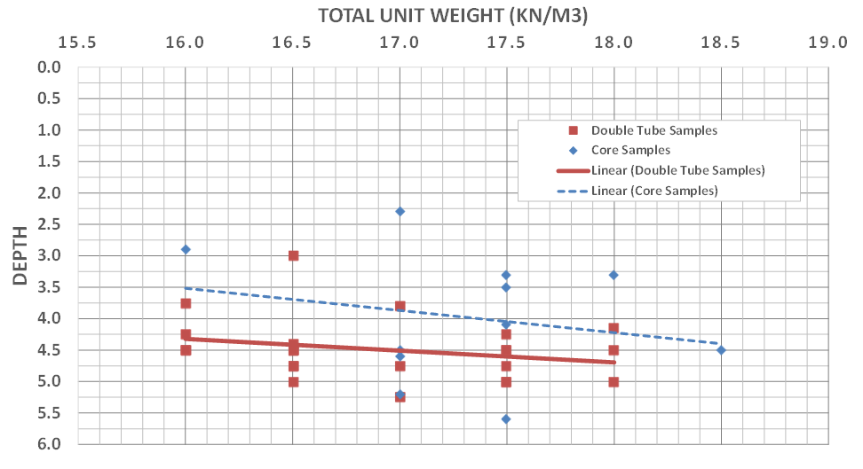 The total unit weight of UCS samples were measured prior to UCS testing and are plotted for all different types of testing as shown in Figure 10. Wet density of samples ranged between 14.0 kN/m3 to 18.5 kN/m3. As shown in the plot, the density of double tube samples trends higher compared to the wet grab samples. Sample size appeared to impact the density, highlighting the scale effect of sampling and testing, and it has been proven many times that smaller scale samples under-estimate the properties of the larger CSM panels and block itself.