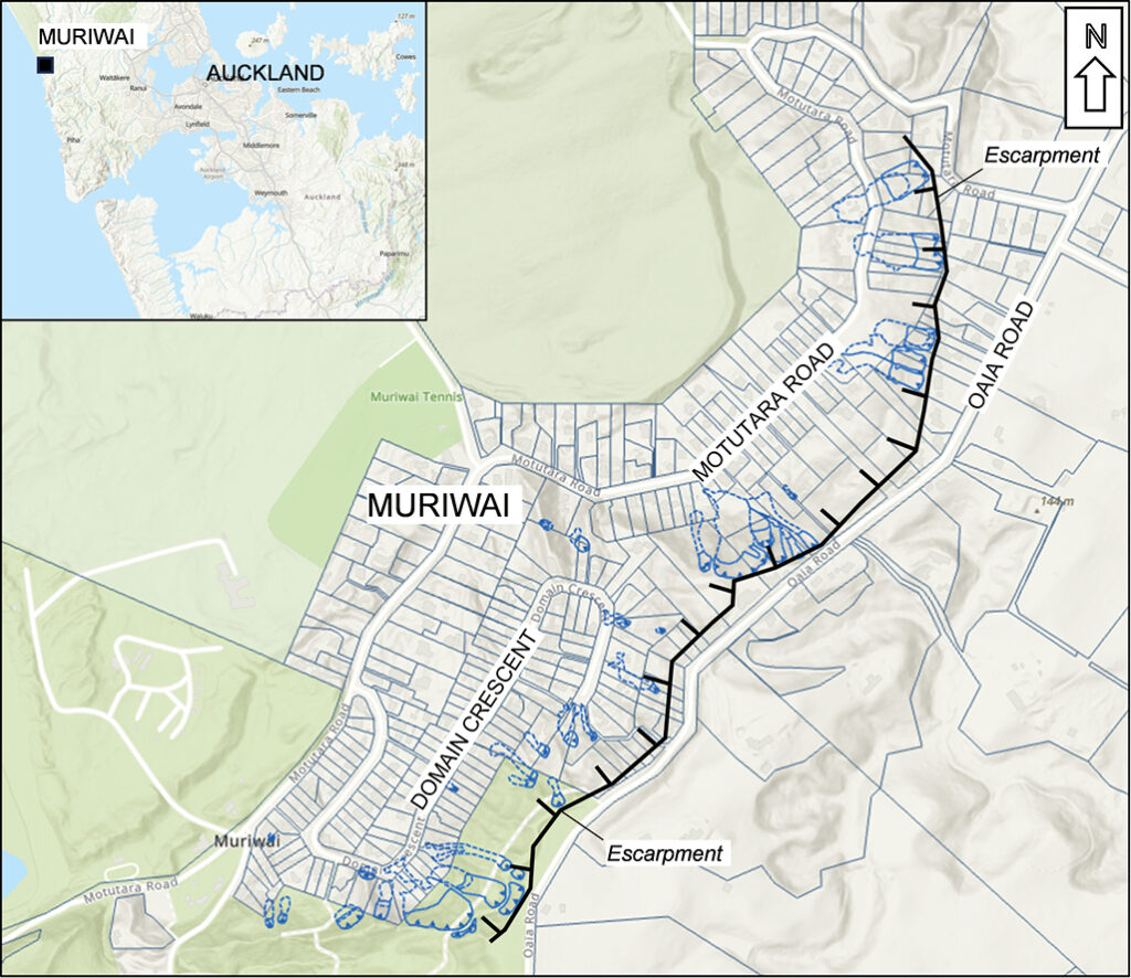 Cyclone Gabrielle caused widespread flood and slope damage to the northern and eastern areas of New Zealand in February 2023. A National State of Emergency was declared on 14 February 2023, when the worst impacts started to be experienced. This extended an existing local state of emergency already declared in Auckland as a result of the Auckland Anniversary Day flooding on 27 January 2023. Some of the most extreme impacts of Cyclone Gabrielle in Auckland were experienced by the small coastal settlement of Muriwai, which is located in the Waitakere area approximately 40\km west of Auckland (see Figure 1). The notable feature of the area is an up to 80\m-high, 1.5 km-long, northeast-southwest oriented escarpment located to the east of the main residential area (see Figure 2A).