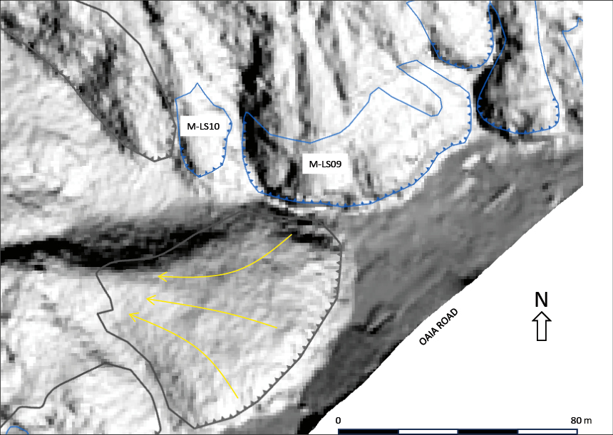 Potential landslide failure zones have been identified based on having similar geomorphology and geology to February 2023 landslide source areas. For example, the bowl-shaped head-scarp shape of recent landslides observed at the crest of the escarpment is similar to the shape of the escarpment where failures did not occur in 2023 (see Figure 9) but have almost certainly occurred at some time in the past. Hence, it can be inferred that much of the escarpment has similar landslide susceptibility due to the similar topographic, geological and possibly groundwater conditions. It was assumed that future landslides on the escarpment would have similar damaging effects to the February 2023 landslides.