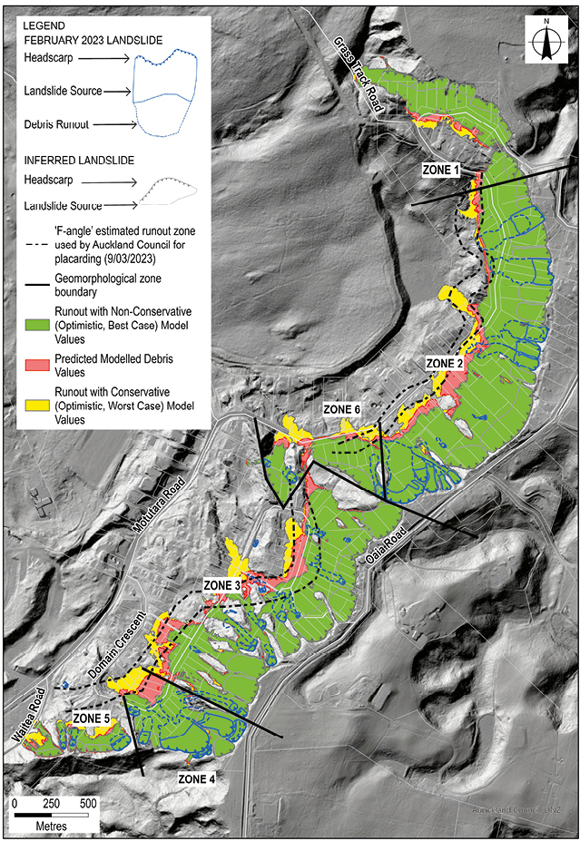 The extent of the RAMMS simulation was in broad agreement with the Fahrböschung empirical angle analysis conducted by Auckland Council to inform emergency evacuation of houses immediately following Cyclone Gabrielle.