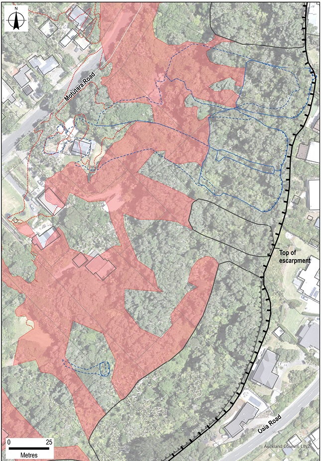 Above the escarpment, red placards were applied to tens of dwellings that were located on the west side of Oaia Road due to the possibility of slope regression undermining buildings at the crest of failed slopes.