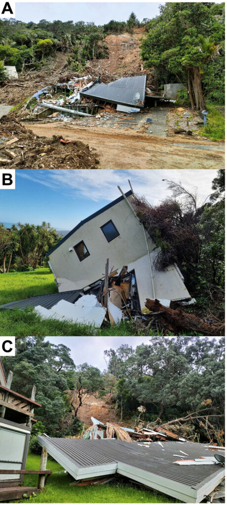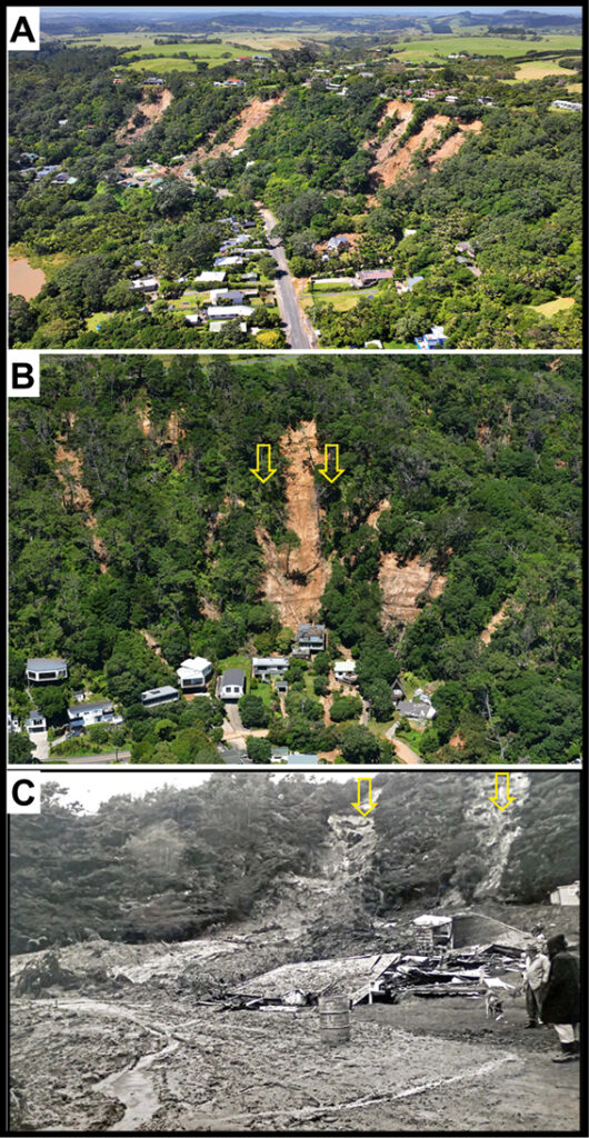 Muriwai had historically experienced similar devastating landslides. In 1965 two fatalities occurred when landslides impacted two residential properties on Domain Crescent at the base of the escarpment (see Figure 2C). Two other occupants were also in the affected buildings, but fortunately were rescued (Hayward, 2022).