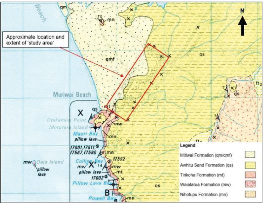 The Muriwai escarpment is underlain by Pleistocene-age Awhitu Sand Formation of the Kaihu Group, comprising coarse sand, clayey, often limonitised (iron cemented), with minor tuff, lignite and siltstone (see Figure 4; Hayward, 1983). Unconformably underlying this is Miocene-age volcanic and volcaniclastic deposits of the Waitakere Group, namely the Tirikoha, Waiatarua and Nihotupu Formations. Modern beach sand forms the dunes system between Muriwai and the modern-day coastline.