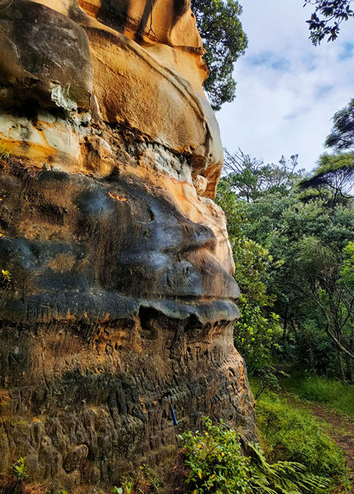 The Awhitu Sand Formation can broadly be described as a slightly to moderately weathered, orange, yellow and white, massive to thickly bedded sandstone that is extremely weak to weak. Beds are non-continuous, sub-horizontal and dip slightly to the north. Cross-bedding is observed in steep exposures consistent with their coastal dune origin and are highlighted by red iron-staining. There are occasional non-continuous laminated to thick layers and lenses of silt, clay and peat. There are occasional tight, vertical joints.