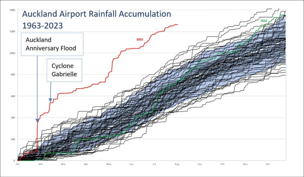 The rainfall prior to, and during, Cyclone Gabrielle was a primary trigger of regional slope instability. January 2023 was Auckland’s wettest month since records began, with the National Institute of Water and Atmospheric Research (NIWA) describing the peak storm rainfall of 539 mm at Albert Park in Auckland on 27 January as being at least a 1-in-200-year event (NIWA, 2023). Over 140,000 recorded landslides were triggered by these events across the North Island of New Zealand (GNS, 2023) of which approximately 50,000 were in the Auckland Region.