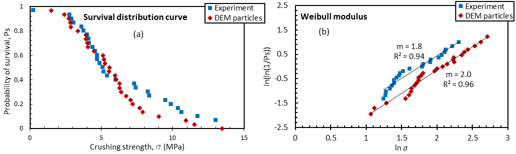 In the current study, the above equation was used to estimate the Weibull modulus for pumice sand particles with 2 mm diameter based on actual and simulated single particle crushing tests. Figure 4(a) shows that a similarly shaped survival probability curve was achieved in the DEM simulation as that in actual crushing strength tests on pumice sand particles. Moreover, Figure 4(b), which illustrates the Weibull probability distributions obtained from the laboratory experiments and the DEM simulations, shows a good level of