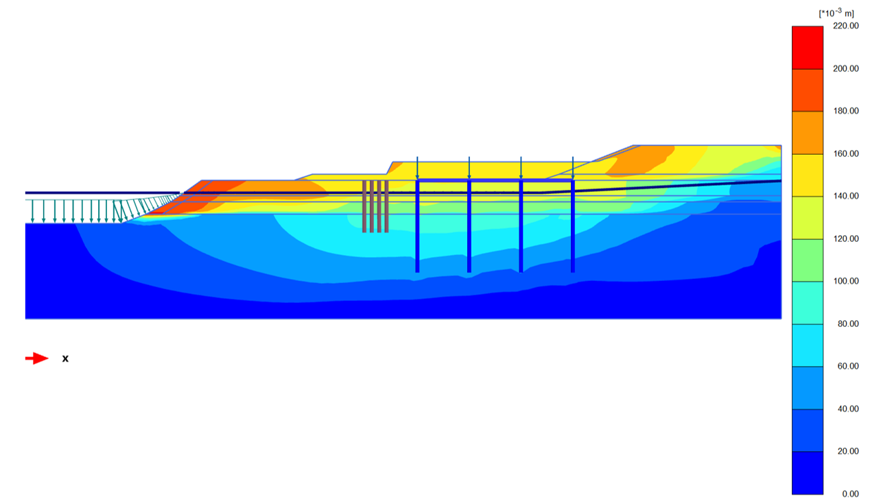 Given complex interaction between the structural piles and the laterally displacing site soils, it was considered prudent to carry out a finite element analysis of soil-structure interaction using computer program Plaxis as follows: