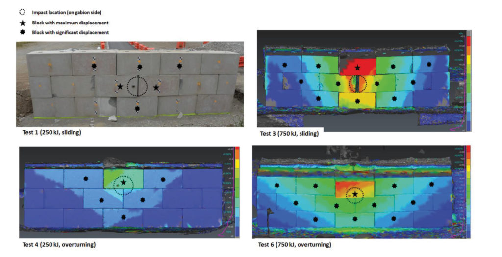 Stacked mass concrete blocks have been used in these areas as temporary rockfall protection walls, however the energy capacity, deformation and damage response of these of structures is unknown. The question arose as to whether a permanent rockfall protection wall could be developed using stacked concrete blocks that could be quickly erected at locations where the space requirements did not suit existing protection systems. Given the anticipated range of rockfall energies, the rockfall protection solution would need to be able to withstand moderate impact energies in the range of 300 to 400 kJ (or more, if possible).