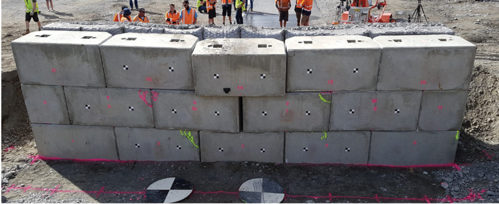 It was necessary to demonstrate the performance and capacity of the wall before it could be approved for use on site.Full-scale physical testing was performed at a vehicle impact testing facility. Six tests were undertaken to investigate sliding and overturning failure modes; impact energies were 250 and 750 kJ.Data collected during testing includes multiple high-speed videos and pre- and post-test laser scans.