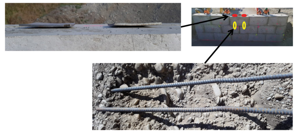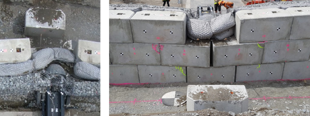 The concrete blocks are installed in an interlocking arrangement and are joined together using vertical steel shear bars. The 32 mm diameter steel bars are installed within a 100 mm diameter open duct, affixed with a plate and nut in the top block.The system is able to dissipate energy on large-scale impact via deformation of the rock and sand gabion layers and sliding and rotation of the individual rigid blocks, while still remaining joined as a coherent barrier to further rockfall.